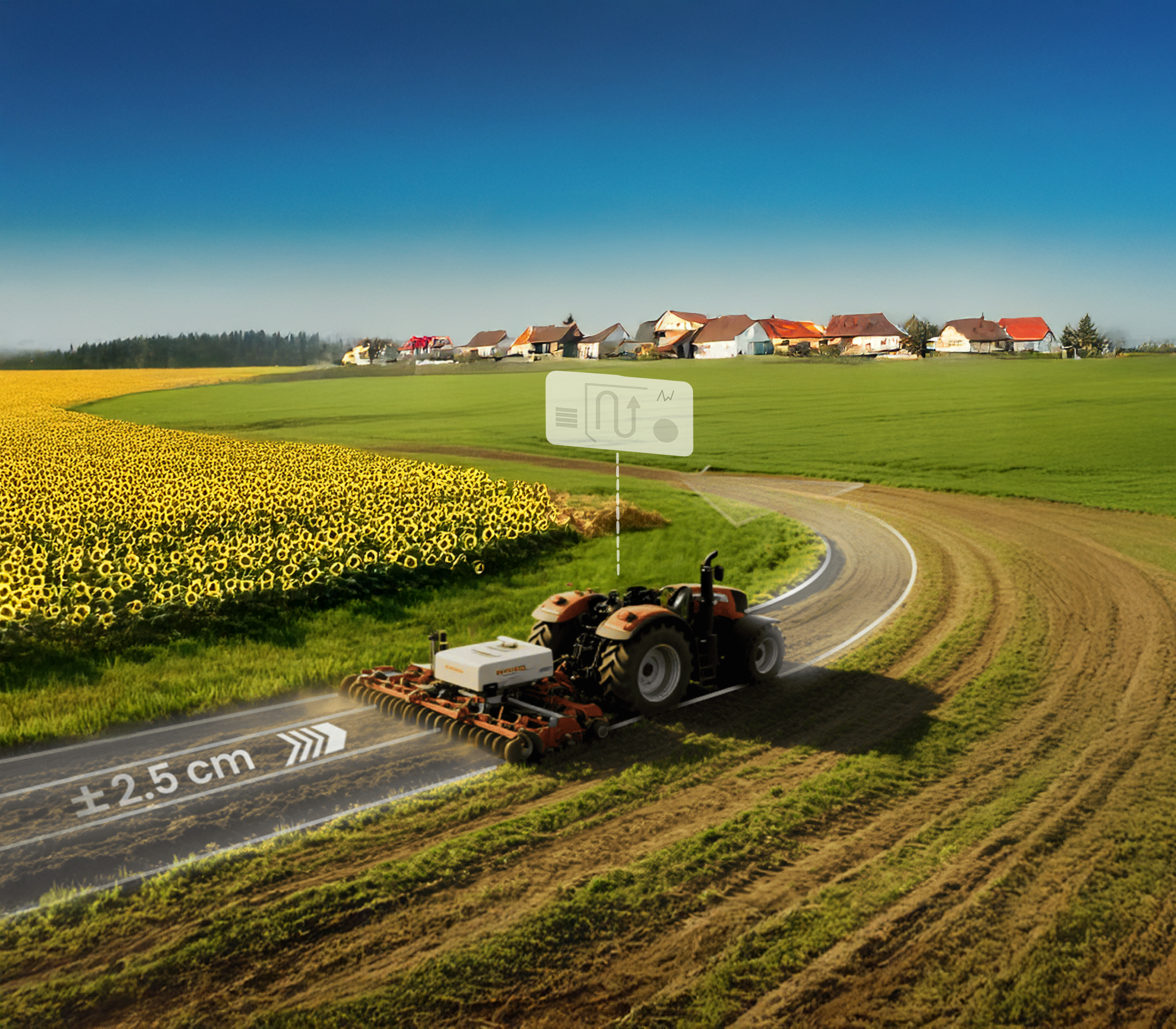 Високоточне позиціонування — система GNSS RTK та датчики (гіроскоп, акселерометр, магнітометр) визначають координати трактора з сантиметровою точністю